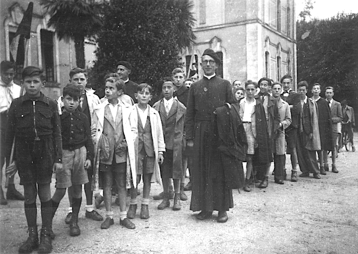 Enfin, quelques photos perdues dans les archives, dont l'une ci-contre : L’étendard fièrement levé devant le hall d’entrée du Collège porte le logo d’une paroisse d’Ile-de-France, Saint Philippe du Roule ainsi que des inscriptions évoquant les années 1940 !